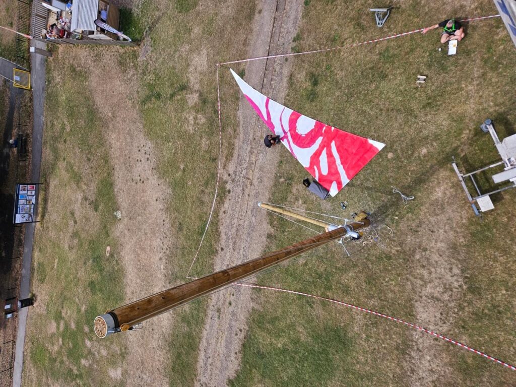 A clear part cloudy day with light winds was the perfect conditions to attach the timber booms to the mast, install the rigging and raise the sails for the first time!