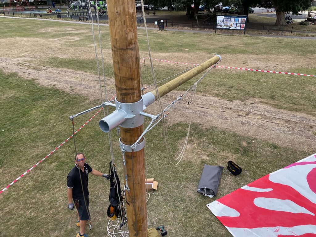 After the installation of the halyards, Jay worked entirely from the mast, harnessed in, climbing the ropes, abseiling and swinging around the structure like a high-ropes circus act.