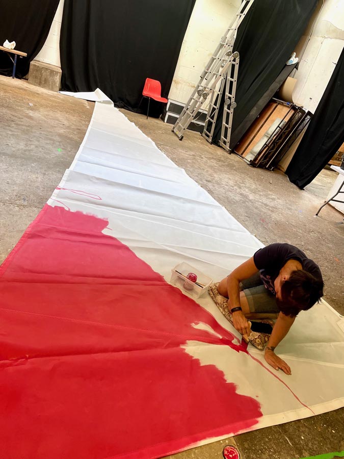 The other challenge was that the ink tended to bleed in to the fabric, creating furry, blotchy edges rather that the nice crisp edges I’d envisaged and how they came out in the trials on the little scraps of sailcloth. We worked out the issue was because we were using a lot of ink to cover the big areas so there was just a lot more ink in the fabric to bleed out. The solution, we discovered was to paint the outlines several times with a dry brush to build up layers of colour and then infill the big areas with a big fully load brush. The painted outlines became a buffer stopping the ink bleeding out.